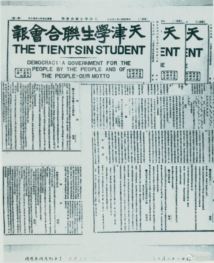 1919年7月21日,周恩來(lái)任主編的《天津?qū)W生聯(lián)合會(huì)報(bào)》創(chuàng)刊。刊名下用英文寫著“民主:一個(gè)民有、民治、民享的政府——我們的箴言?!?/span>
