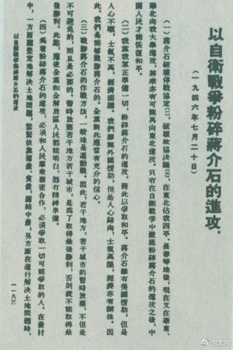 1946年7月20日,中共中央向全黨發出《以自衛戰爭粉碎蔣介石的進攻》的指示,號召全黨全軍樹立打敗蔣介石的信心,并規定了戰勝敵人的正確方針、原則和方法。圖為當時的報道。